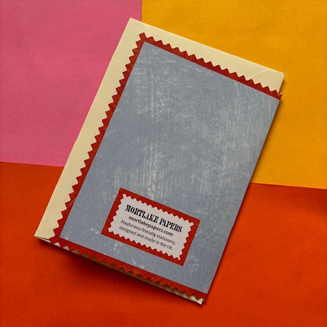 These die cut cards are a reproduction of a collage by Alice and are printed in the UK on 100% recycled, FSC approved paper that is carbon balanced at source. Each card comes with a recycled vegan envelope (free from animal glues and pigments) and is packaged in a fully compostable 'cello' bag made from vegetable starch.