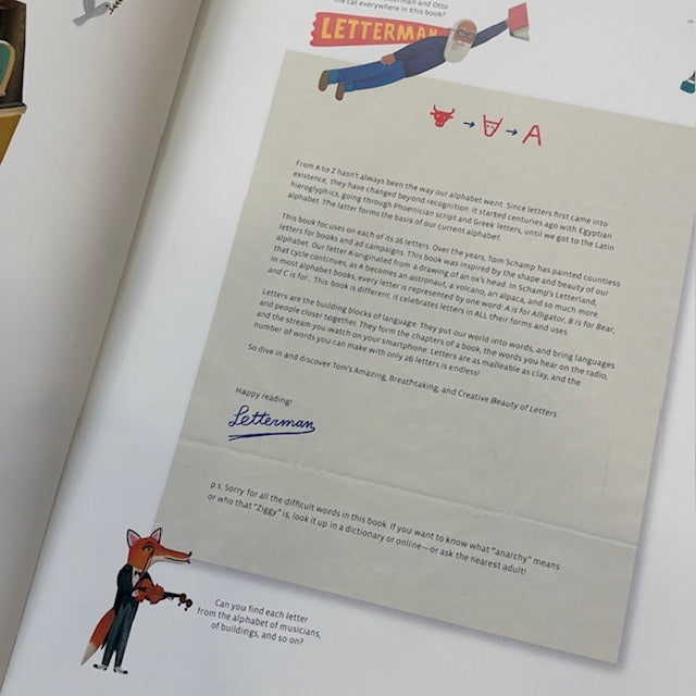 In this vibrant and wildly imaginative alphabet book, bestselling author and illustrator Tom Schamp invites readers to explore Letterland, a place where every letter leads to a world of playful discovery. But this isn’t just an ABC book—it’s a colourful, interactive look-and-find adventure filled with hidden treasures and unexpected delights. Each page teems with whimsical scenes, surprising characters, and layered visual storytelling that turn learning the alphabet into a joyful exploration. Can you spot the animal alphabet? The musician alphabet? The construction alphabet? As readers follow Otto and the mysterious Letterman on their journey, they’ll uncover curious objects, secret words, and dozens of clever connections—all woven into a rich tapestry of pattern, colour, humour, and imagination.