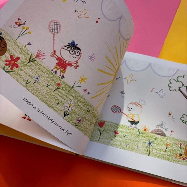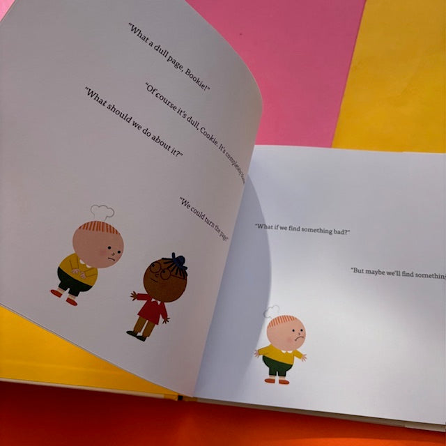 In this companion to Bookie & Cookie, the friends find themselves on a blank page, wondering what might be next. Bookie imagines something wonderful such as a bright sunny day, but Cookie worries that it might be something terrible, like an awful stormy day. "We might find a field full of butterflies," Bookie suggests, but Cookie is afraid it might instead be a marsh full of mosquitoes! Will Bookie ever be able to convince his nervous friend to turn the page and find out? A delightful surprise is waiting there.