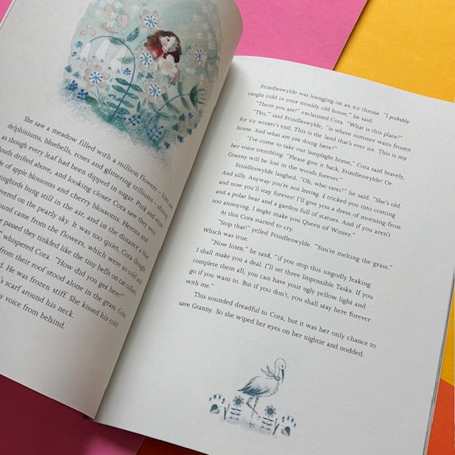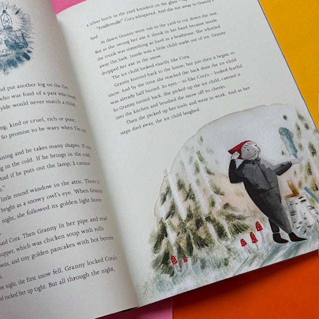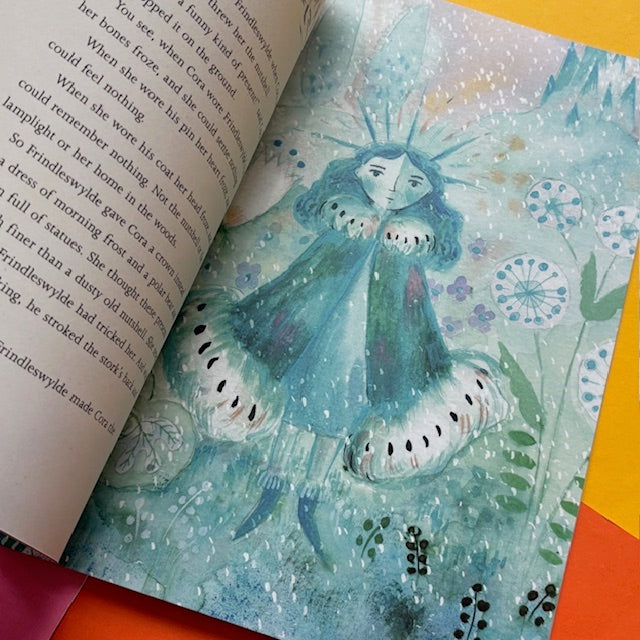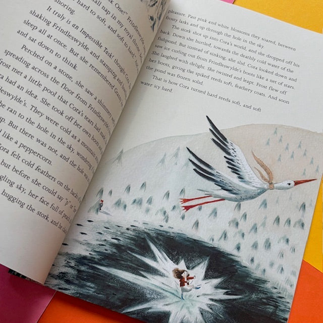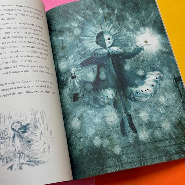 When the mysterious boy Frindleswylde enters Cora and Grandma's house in the woods, he steals the light from their lantern. Without it, Grandma will not be able to return home after work in the dark. Cora is determined to get the lantern back, but first she must follow Frindleswylde down a hole in the pond that leads to his magical frozen kingdom, where he sets her three Impossible Tasks. Reminiscent of The Snow Queen, beautifully written and sumptuously illustrated, Frindleswylde is a classic in the making.