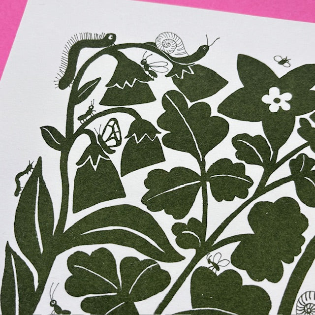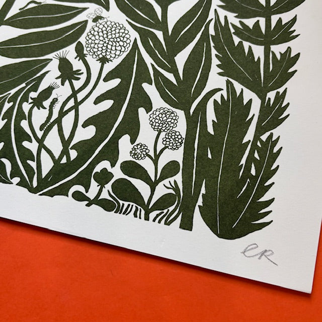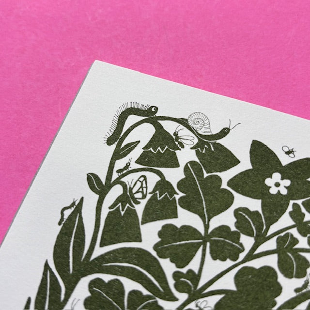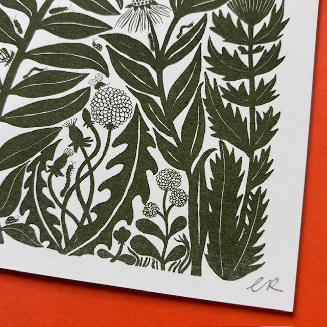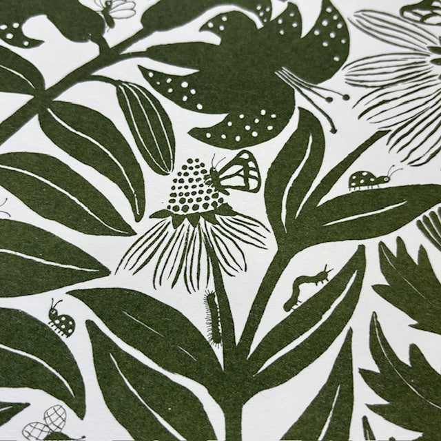 Risograph Printed in dark moss green with soy-based ink on smooth, cream, tree-free paper made from renewable bamboo, cotton, and sugarcane.