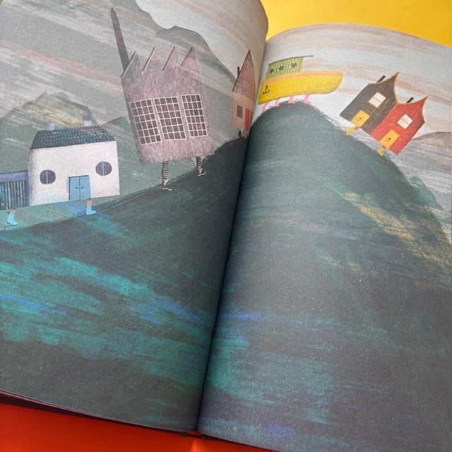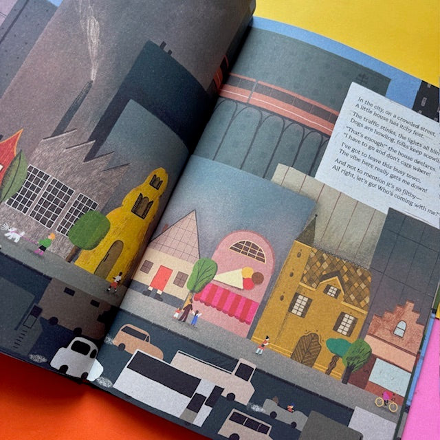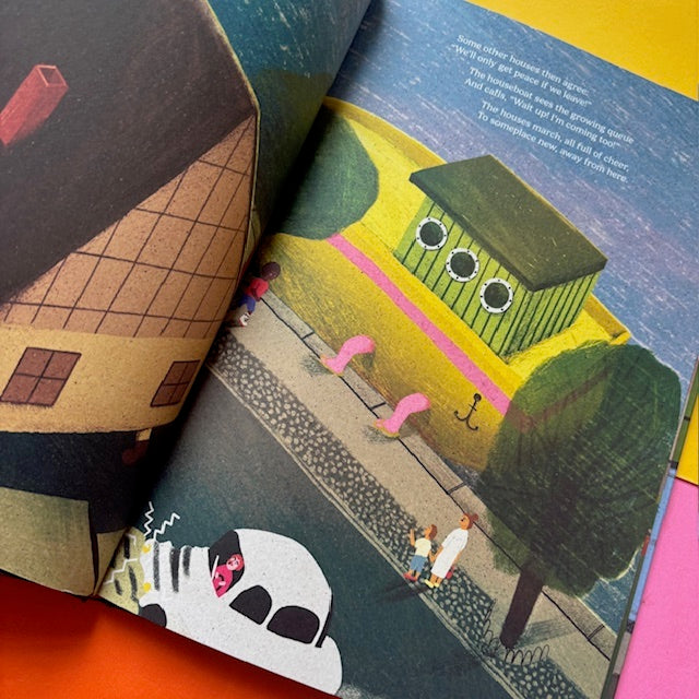 Homesick House tells the story of a city street that has had enough of urban life. One day, the houses pack up and leave, setting off in a caravan to explore the world. Along the way, each house meets an animal that feels just right and welcomes it inside.