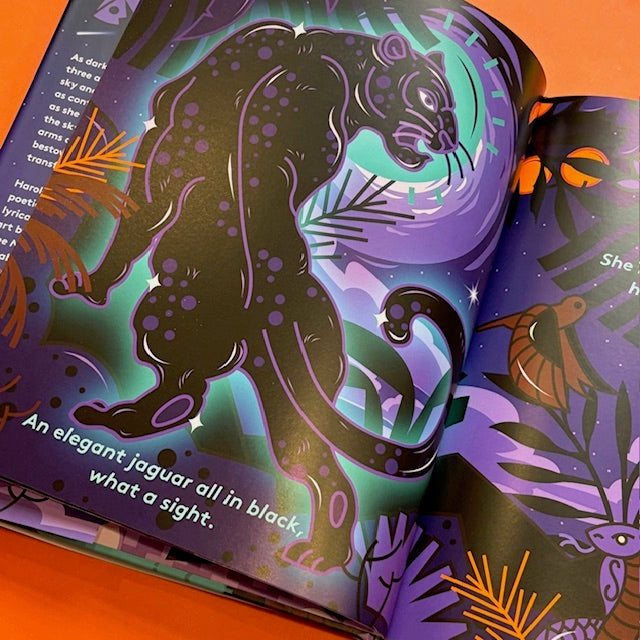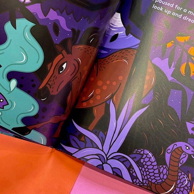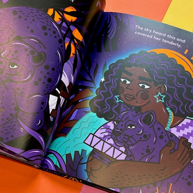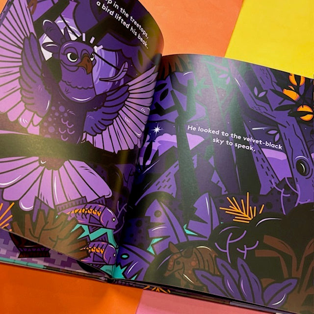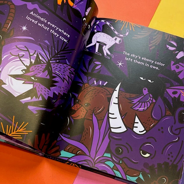 As darkness settles over the forest, three animals gaze up at the night sky and wonder how they can be as confident, proud, and fearless as she is. Hearing their wishes, the sky takes the animals into her arms and, with a gentle embrace, bestows upon each a powerful and transformative gift.