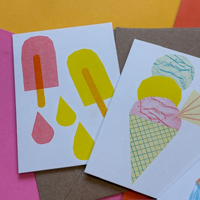 ‘Icecream’ Pack of 3 Risograph Printed Cards, in yellow, aqua and red.
