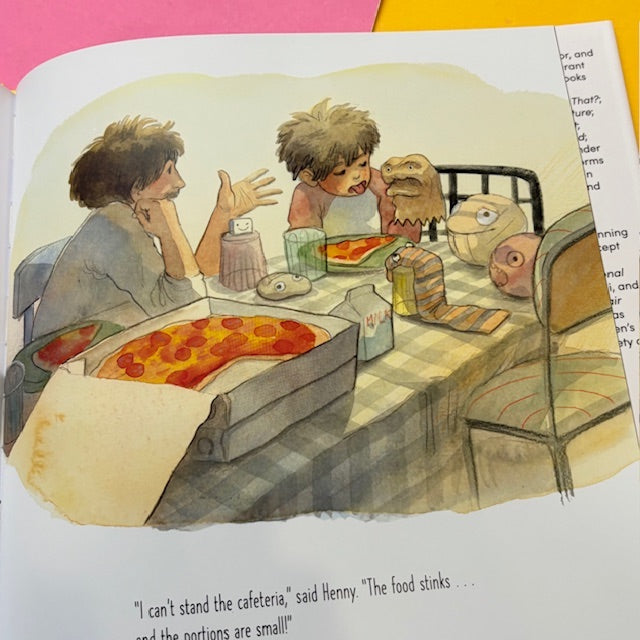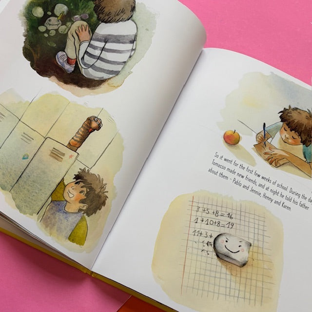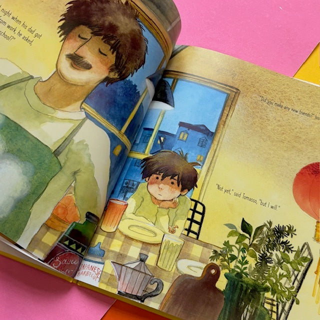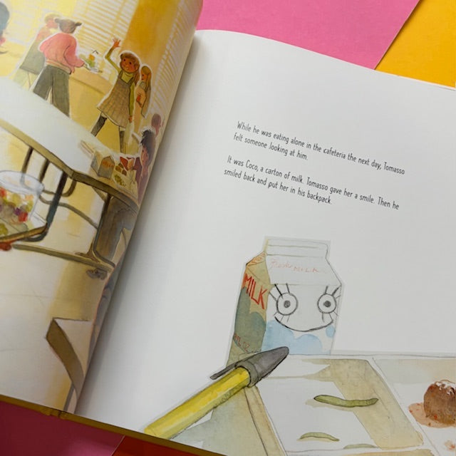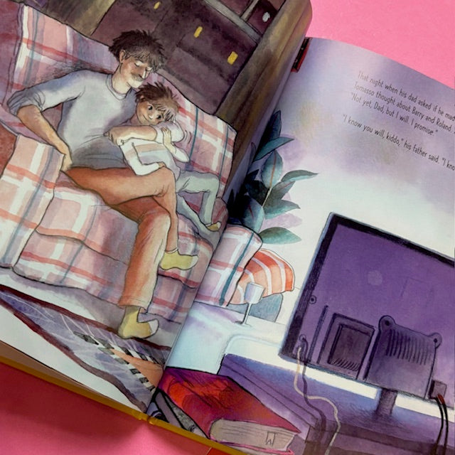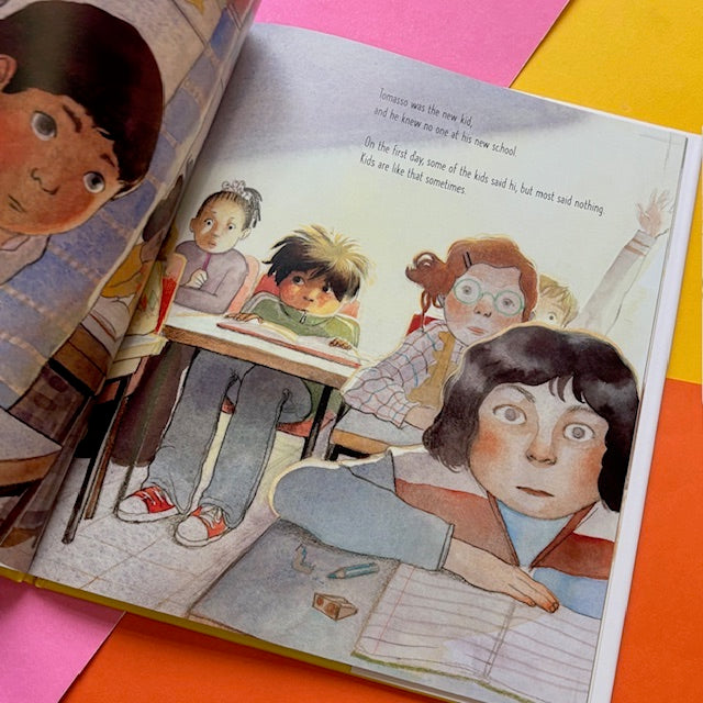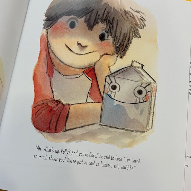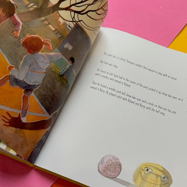 Tomasso doesn’t know anyone at his new school and has no one to play with at recess. So, knowing his dad will ask, he resolves to make a few new friends. Each day his crew grows; there’s Roland (a foam ball), Coco (a milk carton), and Karen (a very pink eraser). But when his dad insists on having his friends over for pizza, Tomasso knows that soon his secret will be out. Will his dad welcome his new friends, even if they’re not who he expects?