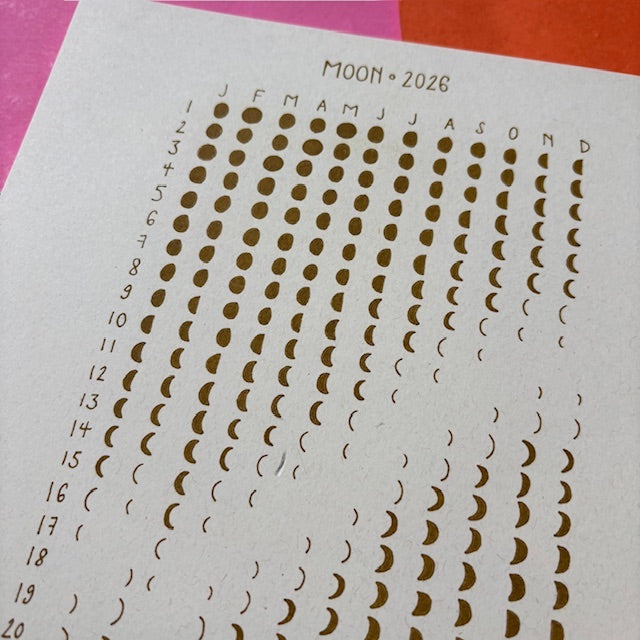 A riso print of 2026's lunar calendar in gold ink. Double sided - the front depicting the whole year and the reverse listing the full moon, equinox and solstice dates. All dates are for the northern hemisphere. Riso printing is one of the most ecological. It uses vegetable inks to print, and these calendars are printed on flecked recycled card. Paper size is UK A4 - 21 x 29.7cm