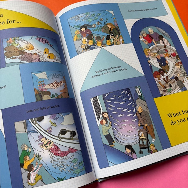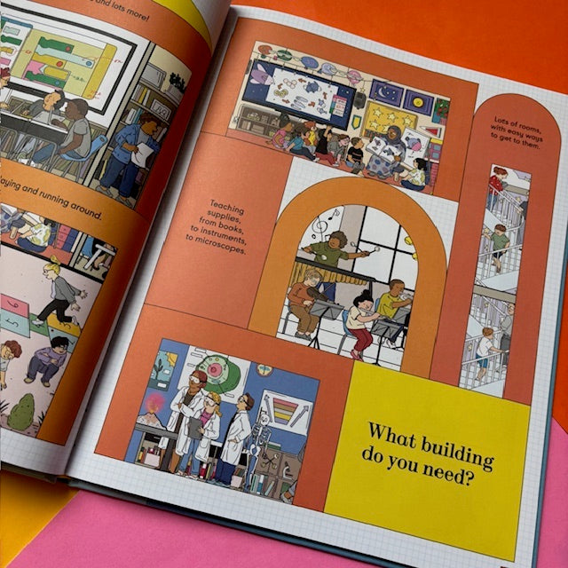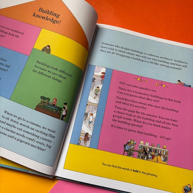 A playful introduction to design and architecture with cutaway scenes of ten buildings, featuring an interactive guessing game and search-and-find In this interactive first book of architecture, children discover how architects design everyday buildings, from planetariums, aquariums, and airports to supermarkets and shopping malls, so that they best meet their users’ needs. Set up as a guessing game, the book presents clues that invite readers to guess which type of building is needed in 10 different scenarios. For example, what building do you need for students, teachers, and learning about science, history, and art? A school! Children continue the fun by looking for the hidden architect on each spread.