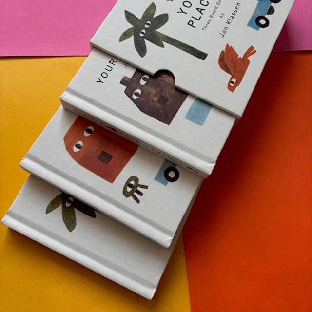With a minimal tableau of familiar objects and a gentle rhythm suited for reading aloud, a farm, a forest and an island are assembled with all their items, ending with bedtime as the sun goes down. These are places for a young child to have whenever they want to go there. This trio of board books, focusing on safe spaces, comfort, and imagination, signals new ground for Jon Klassen, even as peculiar touches of whimsy stamp them as iconically his.